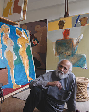 Jatin Das was born December 2, 1941 in Mayurbhanj, Orissa, and studied at the Sir J.J School of Art in Bombay under Professor SB Palsikar. He primarily uses oil, watercolor, ink and conte. In a career spanning over five decades, his works have been part of several public and private collections in India and abroad. Most notably, he has done several murals and sculpture installations, including a large mural at the Parliament House entitled “Mohenjo Daro to Mahatma Gandhi”, commissioned by the Parliament of India on the occasion of 50 years of India's Independence.