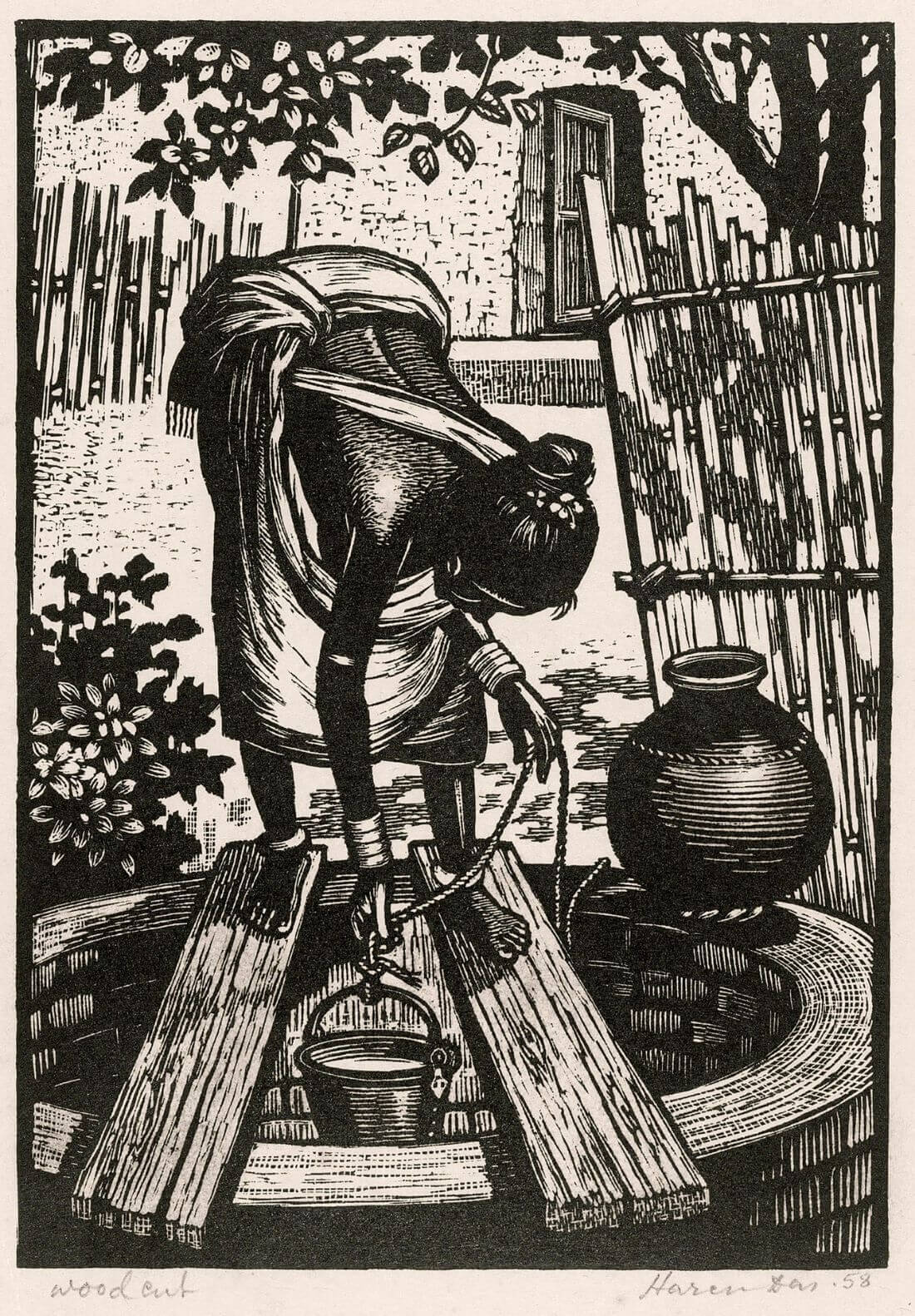 About Woman At The Well Haren Das Bengal School Art Woodcut Painting