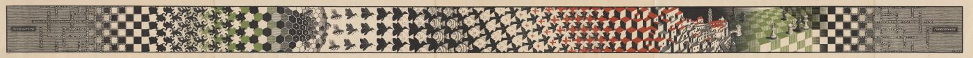Metamorphosis II is a woodcut print by the Dutch artist M. C. Escher. the concept of this piece is to morph one image into a tessellated pattern and then slowly alter that pattern eventually to become a new image.The process begins left to right with the word metamorphose (the Dutch form of the word metamorphosis) in a black rectangle, followed by several smaller metamorphose rectangles forming a grid pattern. This grid then becomes a black and white checkered pattern, which then becomes tessellations of reptiles, a honeycomb, insects, fish, birds, and a pattern of three-dimensional blocks with red tops.