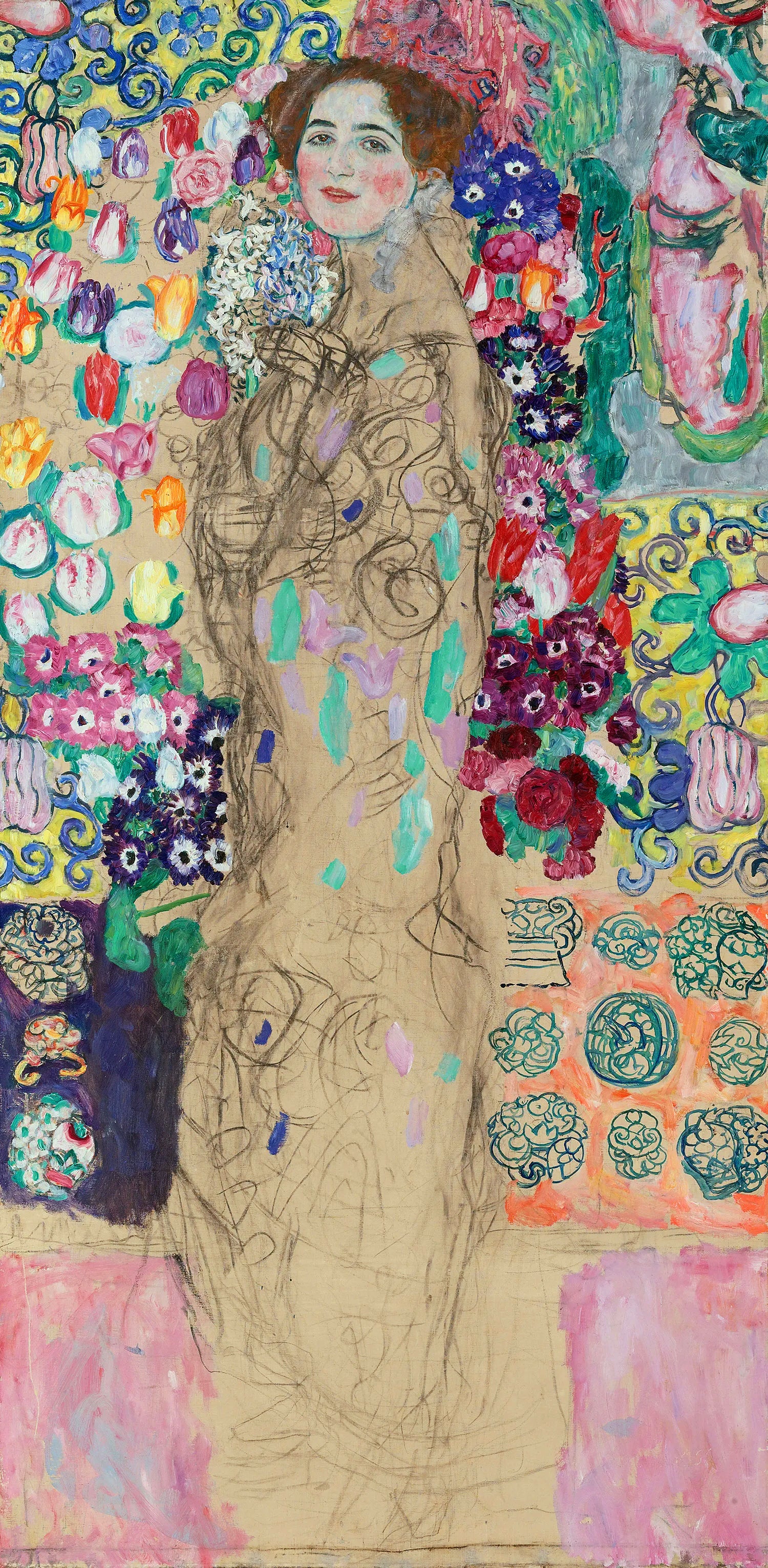 “Portrait of Ria Munk (Unfinished)” (1917–1918) by Gustav Klimt is one of the most poignant and emotionally charged works of his late period—a painting shaped as much by tragedy as by artistic vision.The subject, Ria Munk, was a young woman whose untimely death led her family to commission Klimt to create a memorial portrait. This context gives the work a haunting stillness, as if the figure exists between presence and absence.