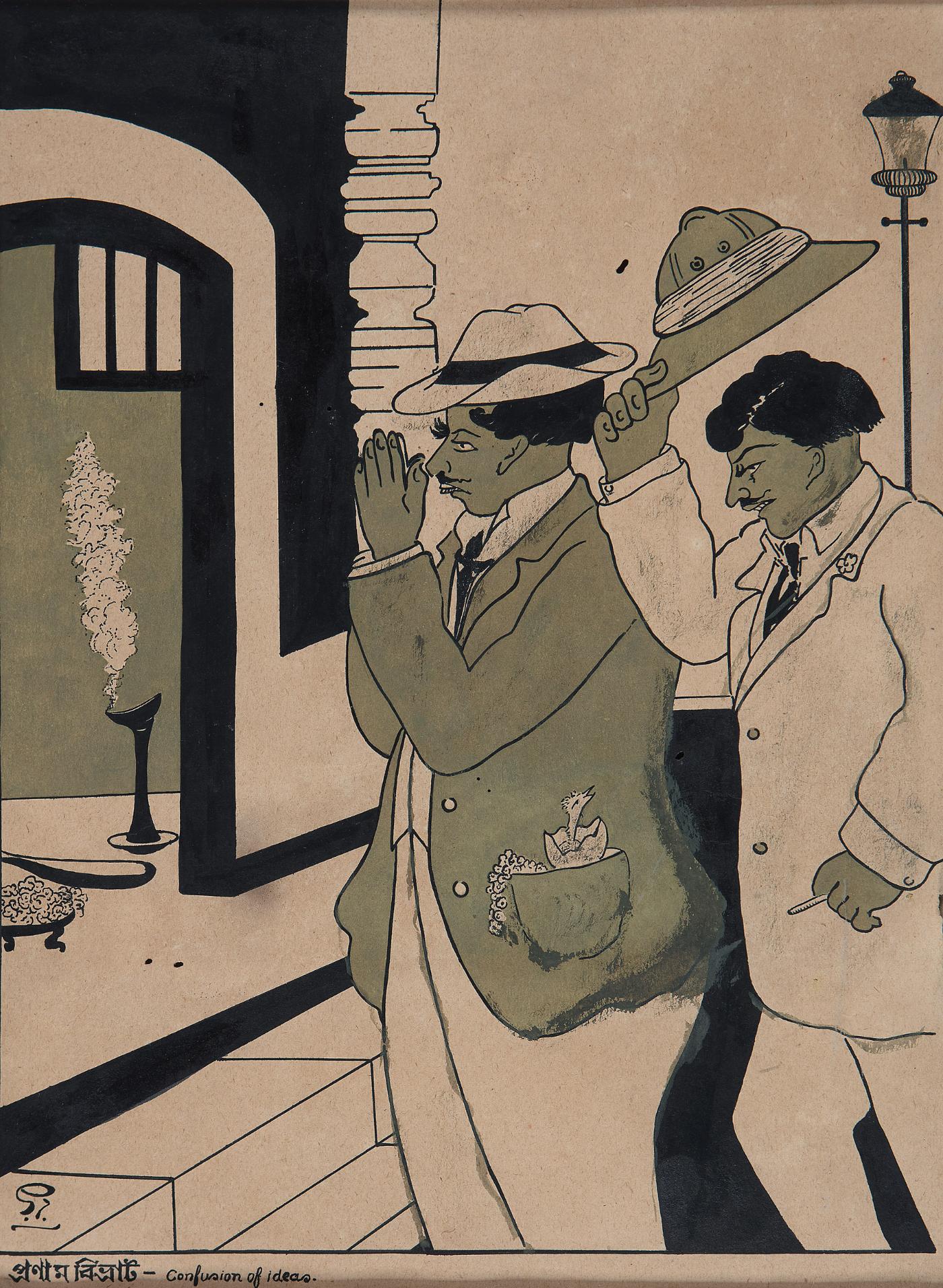 During the early part of his career Gaganendranath was influenced by Far Eastern art styles, in particular Japanese ink wash techniques. However he is best known for his political cartoons and social satires on Westernised Bengalis. Rabindranath Tagore, his uncle commented on his art, thus, in 1938: "What profoundly attracted me was the uniqueness of his creation, a lively curiosity in his constant experiments, and some mysterious depth in their imaginative value.”