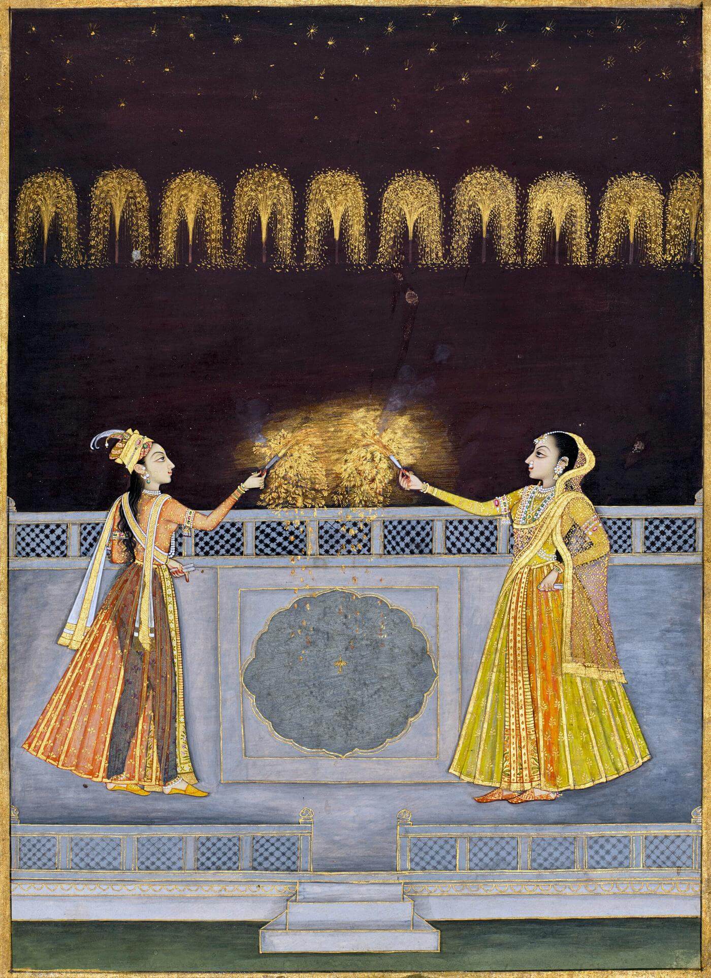 Ladies With Fireworks On A Terrace - Kishangarh Rajasthan c1730 - Vintage Indian Miniature Art Painting - Canvas Prints