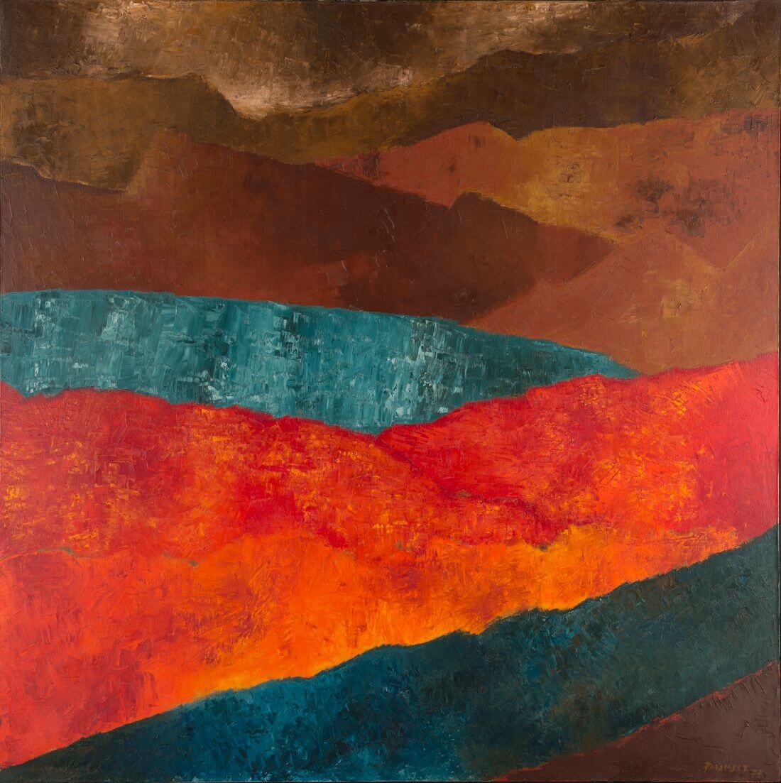 The use of a bold palette, and the importance the artist places on texture and construction, complements his choice of landscape as subject, with earthy tones and vibrant reds, blues and yellows. The colours evoke a sense of movement in an unmoving space.