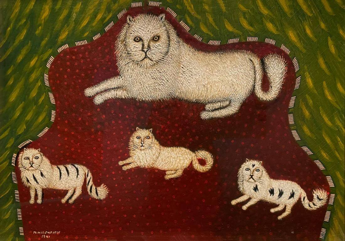 Morris Hirshfield was a self-taught artist (at the age of 65!) of great and near-painful meticulousness. Every mark he made seemed to be accompanied by a projecting tongue and a small groan of inward satisfaction. His favorite subjects included domestic animals – dogs, cats, etc – and, when he painted them, he generally preferred to show them off in family groups.