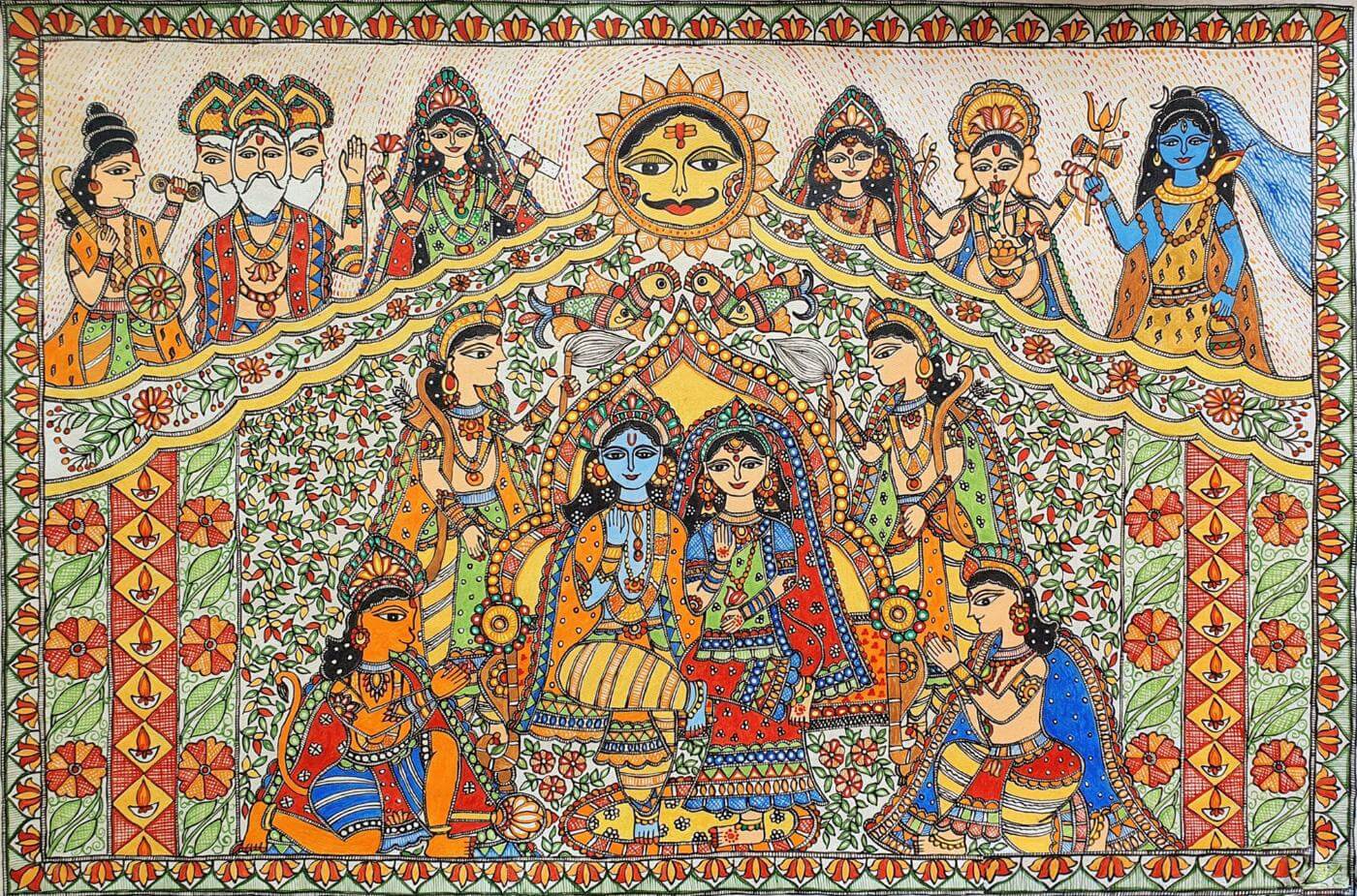 Ram Darbar Pattabhishekam - Siya Ram Laxman and Hanuman - Ramayan Madhubani Mithila Painting - Canvas Prints