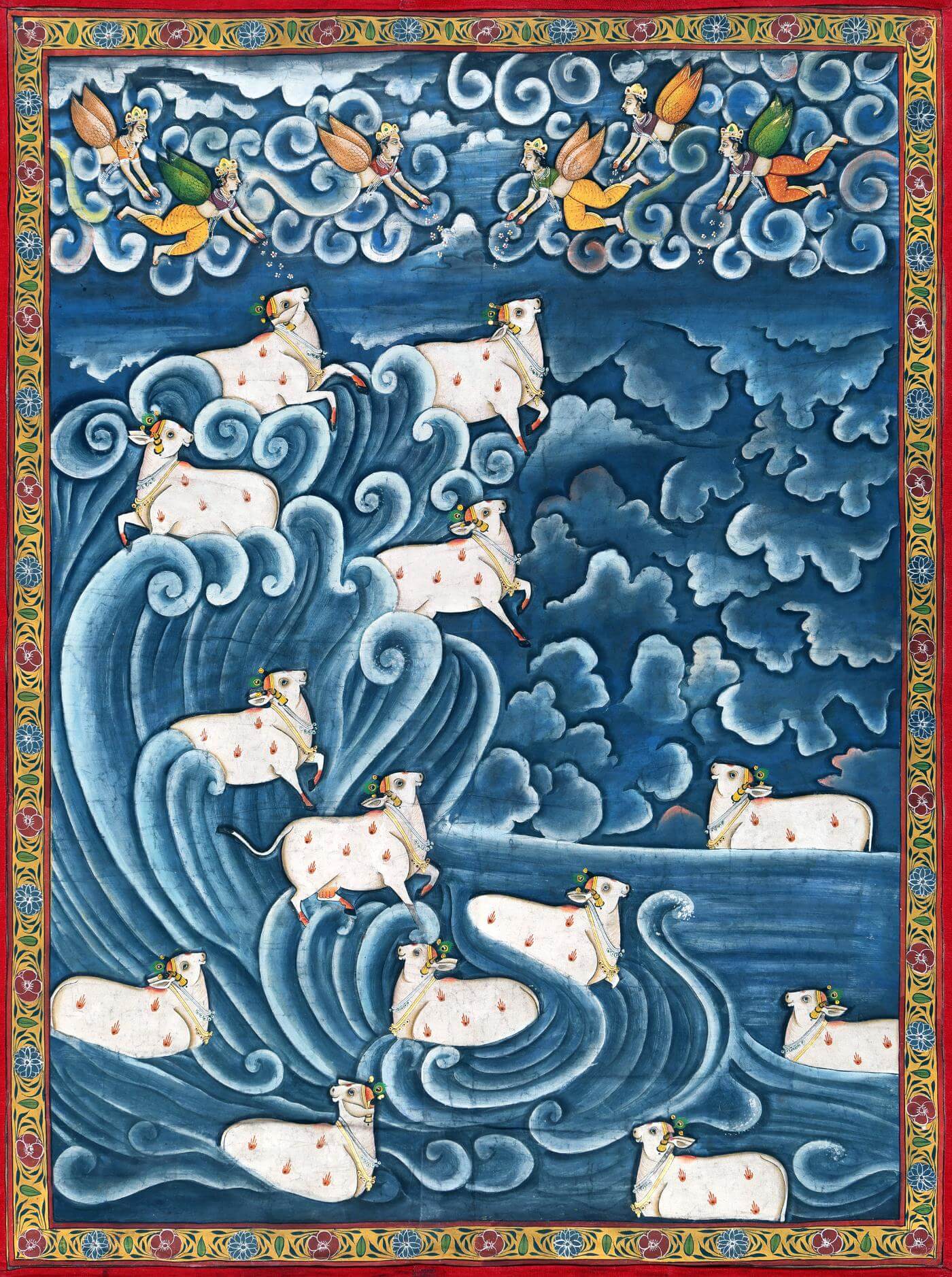 Shrinathji Cows - Krishna Pichwai Painting by Krishna Pichwai. Our posters are produced on acid-free 220 GSM papers using archival inks to guarantee that they last a lifetime without fading or loss of color. All posters include a sufficent white border around the image to allow for future framing, if desired. Product will be shipped in 2-3 days