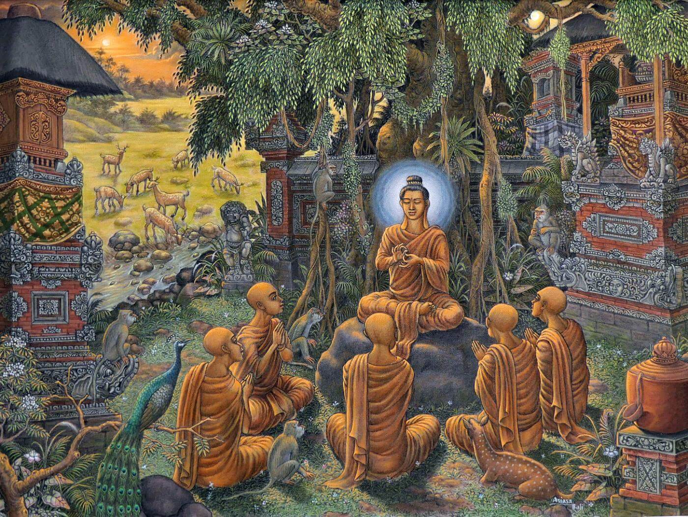 The First Sermon – Balinese Buddha PaintingThis exquisite Balinese painting depicts Lord Buddha delivering his First Sermon at the Deer Park in Sarnath, where he revealed the Four Noble Truths and the Eightfold Path. Surrounded by his first five disciples, the scene radiates serenity and divine wisdom. Characterized by intricate detailing, graceful figures, and warm earthy tones, the artwork reflects Bali’s unique fusion of spiritual depth and artistic elegance, celebrating the Buddha’s awakening and the birth of Buddhism.