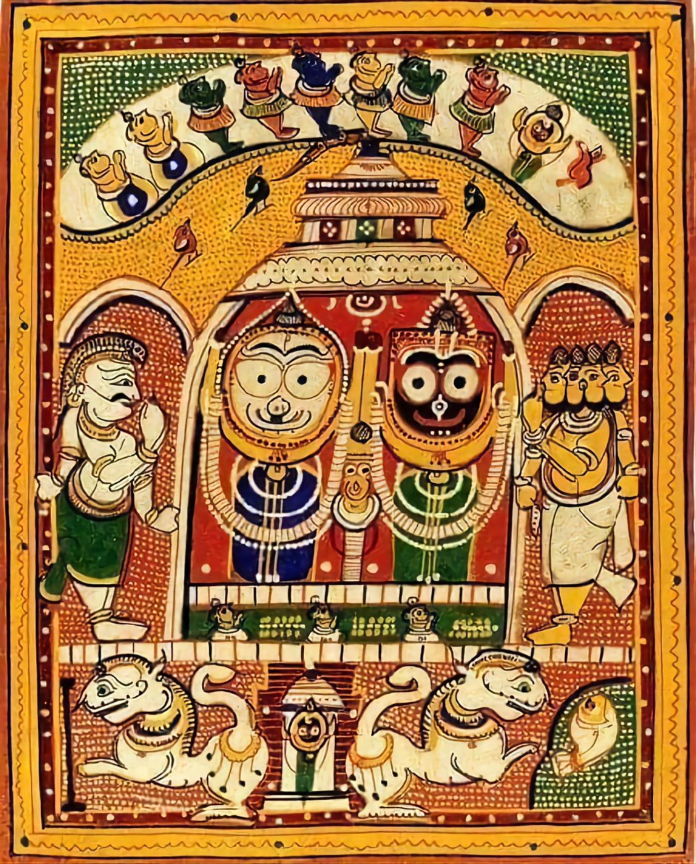 The divine triad of Krishna (as Lord of the Universe (Jagannath)), who is accompanied by his sister Subhadra and older half-brother Balabhadra (Balaram) are represented in a uniquely Odishan style. The painting depicts a major religious festival – the Rath Yatra or the "Festival of Chariots - celebrating Krishna at his temple in Puri, in Odisha (Orissa) in eastern India. The Yatra is a grand procession of three massive, decorated wooden chariots in which the deities travel from the Jagannath Temple to their aunt's home. This powerful display of devotion allows all to see the deities, and pulling the chariots' ropes is considered a great honor that bestows divine blessings and cleanses sins. The procession allows everyone, including those who are not permitted inside the temple, to have a sight of the deities.