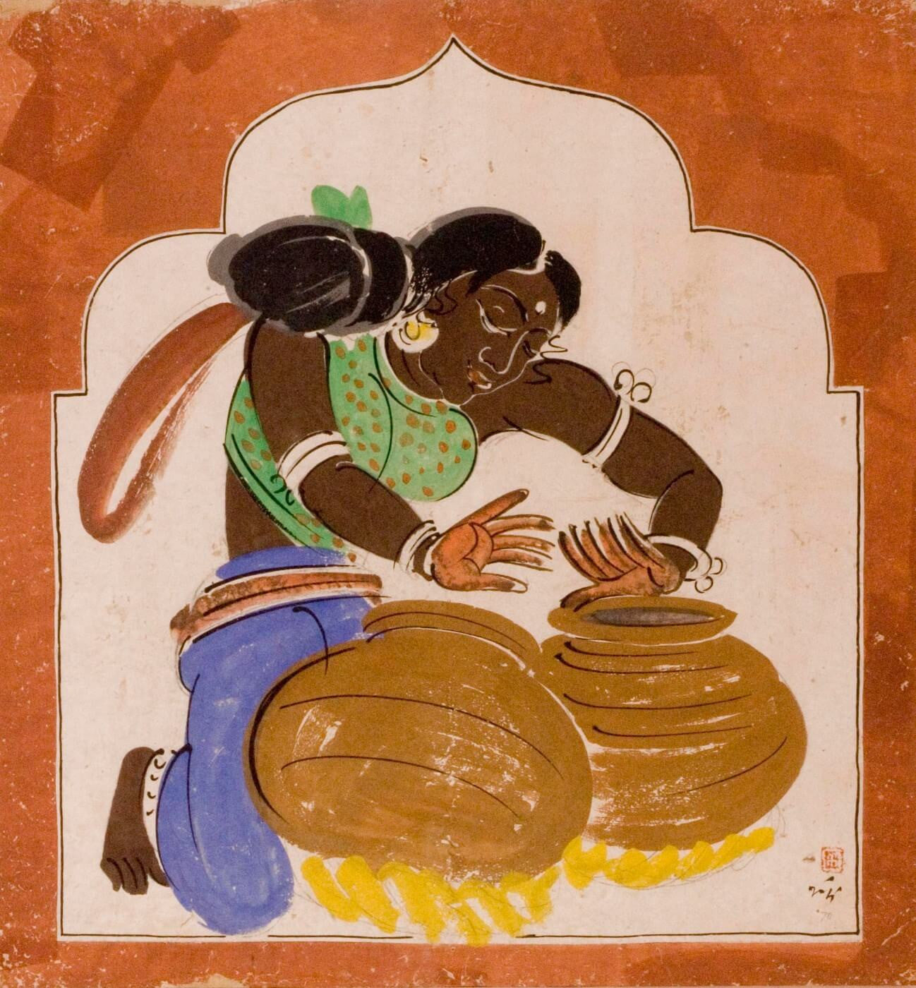Nandlal was fascinated by the potential of folk art and indigenous modes of expression and inculcated them in his works although stylising them in a unique representation for depiction and narration of local life. He began his artistic career in the fervour of the Swadeshi movement, rejecting western colonial norms of art and taking inspiration from the ancient murals of Ajanta and Bagh caves as well as Mughal miniatures.